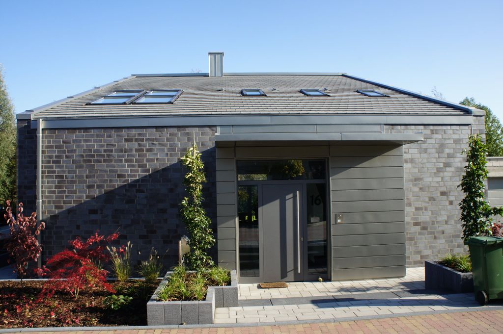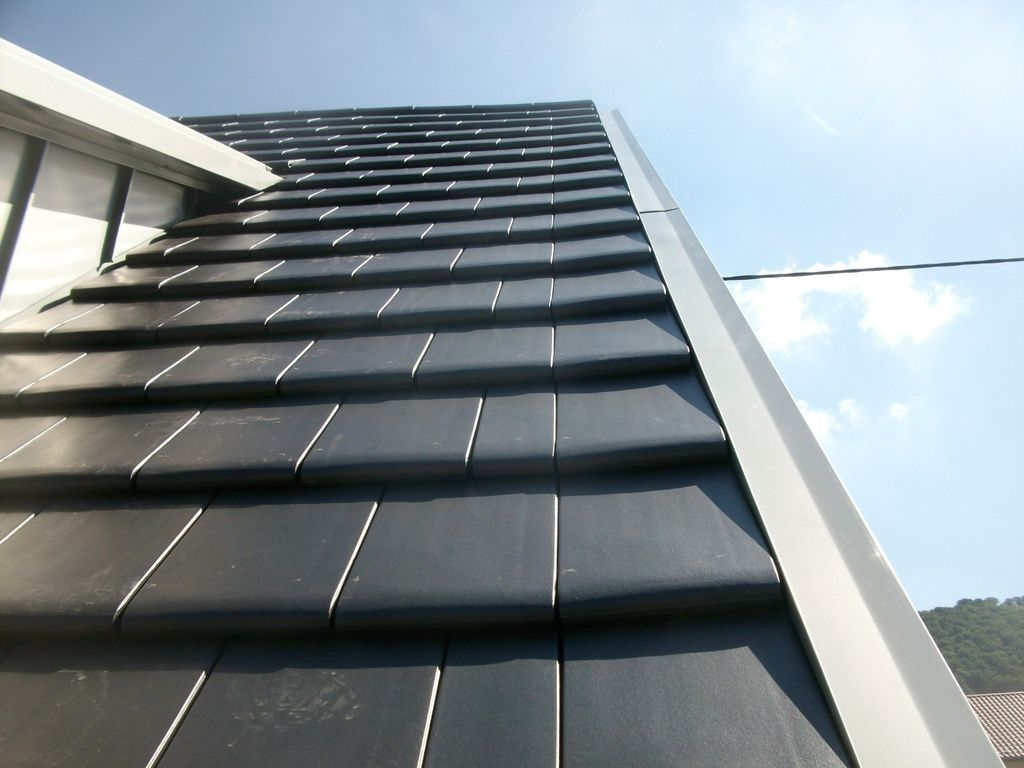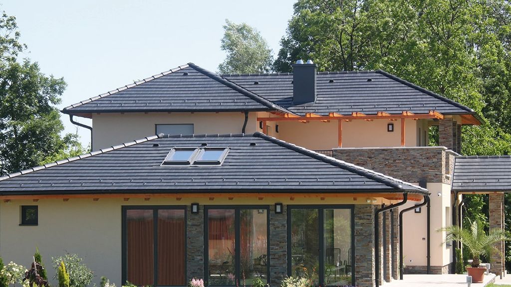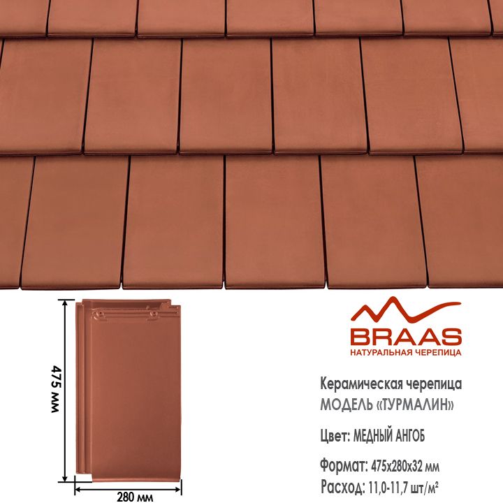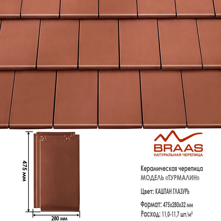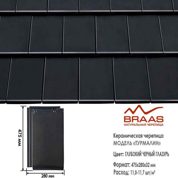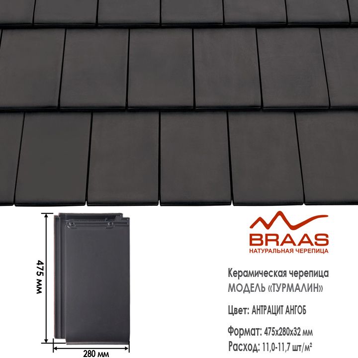 Турмалин - немецкая модель пазовой черепицы. Её гладкая поверхность благодаря специальному покрытию всегда остается чистой и красивой. Уложенная на крыше, она напоминает покрытие из полированных каменных плит. Изумительно подходит для домов в стиле High-Tech.