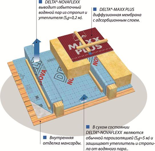Плёнка обладает переменным сопротивлением паропроницанию, что способствует просыханию утеплителя и стропил в тёплый период года, и защите крыши от увлажнения зимой. Комфортный микроклимат обеспечивается благодаря выводу избыточного водяного пара из внутренних помещений мансарды. Благодаря уникальной укладке и применению соединительных лент защищает внутреннее пространство жилища от протечек уже в ходе ремонтных работ.