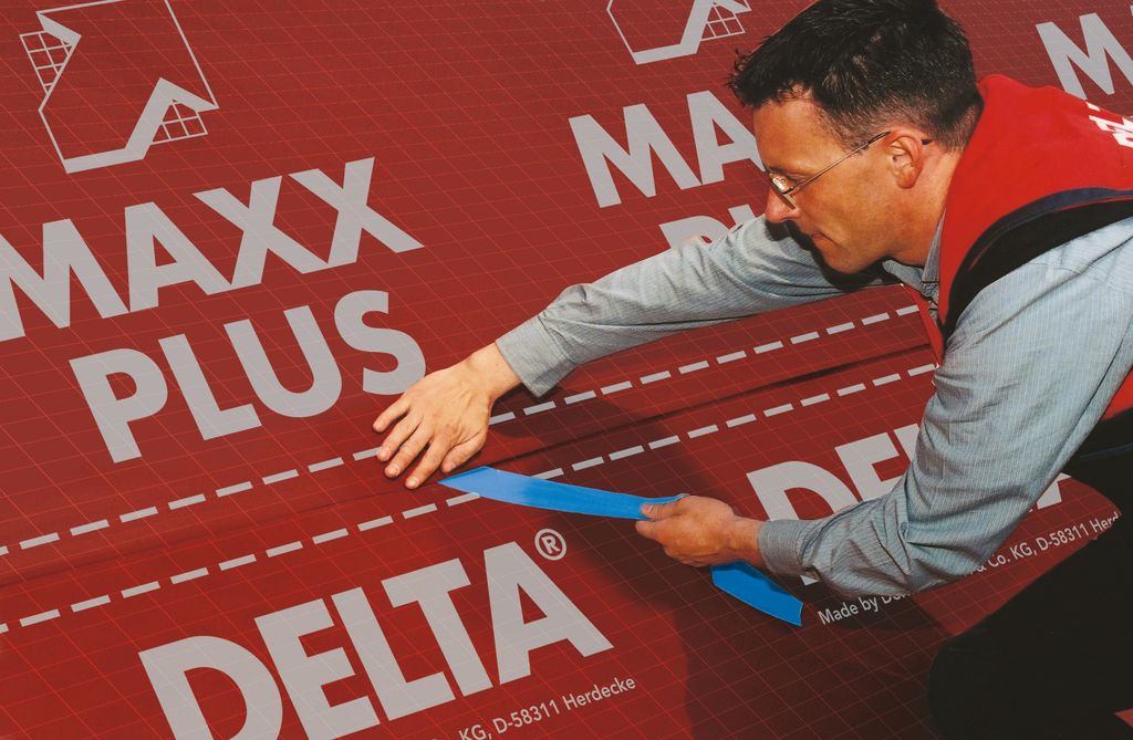 DELTA®-MAXX PLUS укладывается внатяг на стропильные ноги непосредственно на утеплитель без воздушной прослойки. Допускается монтаж на сплошной деревянный настил. Нахлёст рулонов должен быть ок. 10 см, для удобства кровельщиков на мембрану нанесены маркировочные линии. После удаления защитной ленты с самоклеящихся полос прогладьте место нахлёста рулонов - водонепроницаемое и воздухонепроницаемое соединение рулонов будет обеспечено мгновенно.